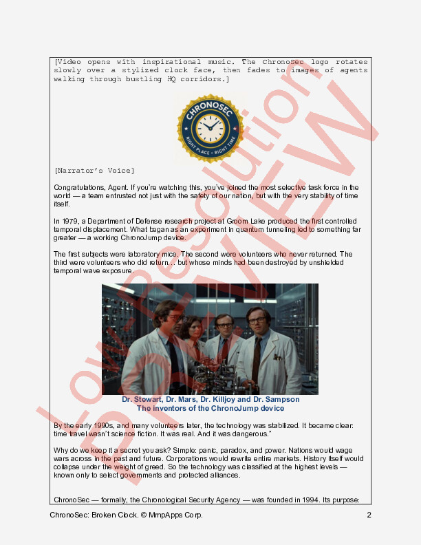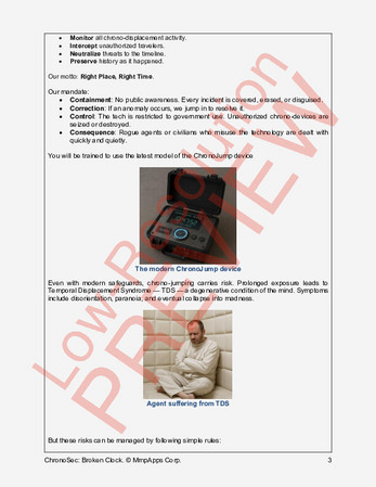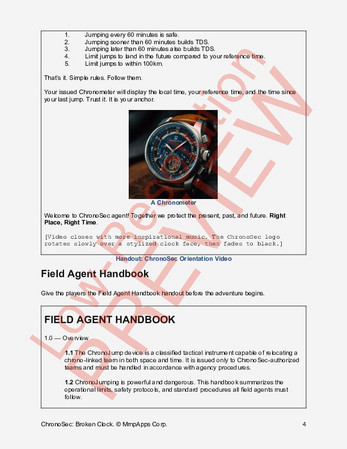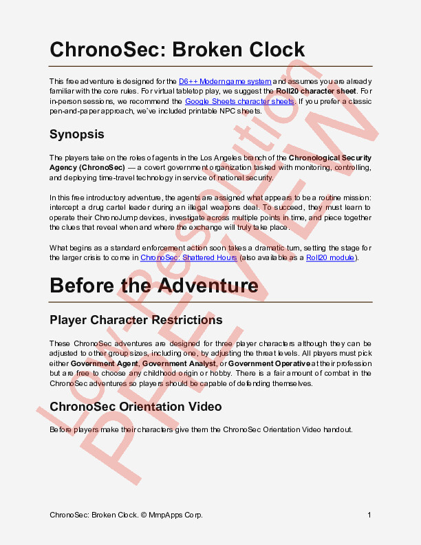 Broken Clock introduces players and GMs to the time-jumping mechanics of the D6++ Modern system through a tightly-paced mystery that plays out in overlapping hours and shifting timelines. It’s an easy on-ramp to time-travel operations—complete with ready-to-print handouts, briefing materials, and full GM notes—and a direct prelude to the full-length adventure ChronoSec: Shattered Hours.