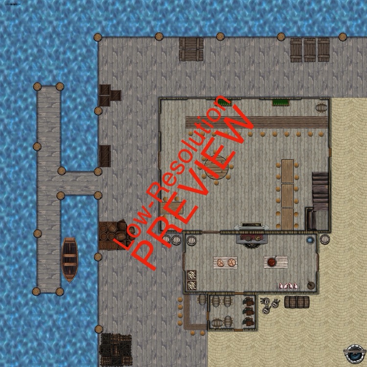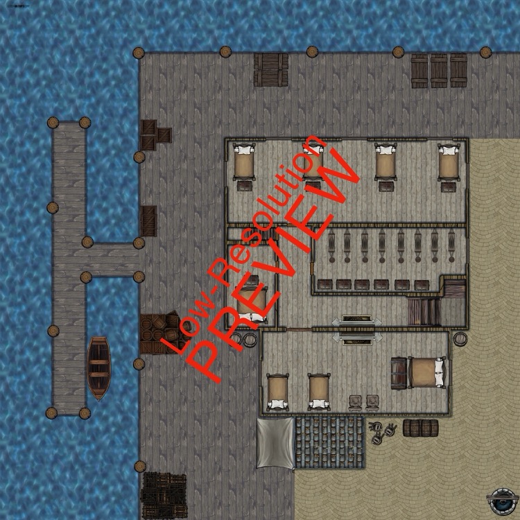 Dockside Tavern is part of our Fantasy Map Collection, offering a detailed view of a seedy, bustling dockside inn. Perfect for any medieval town or city setting, this map captures the atmosphere of shady deals, weary travelers, and waterfront intrigue, making it an ideal location for your next adventure.