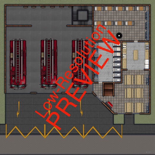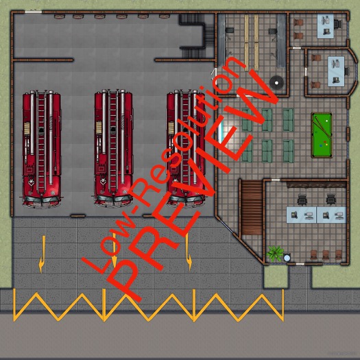 Modern 3-Truck Firehall is part of our Modern Maps Collection. It details a classic firehall found in any small town. There are three levels; versions are provided with and without trucks in the garage.