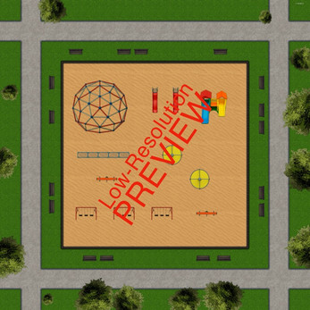 These bright, highly detailed top-down maps depict a modern outdoor playground complete with swings, slides, climbing structures, sand pits, benches, shade areas, and open fields. Perfect for everyday scenes, rescue missions, ambushes, creepy investigations, or tense urban encounters where innocence contrasts with danger.