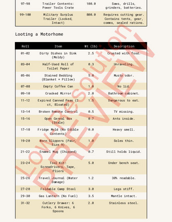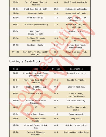 Scavenge the ruins of civilization with 48 richly detailed d100 loot tables covering vehicles, buildings, retail spaces, and more. Whether your world is ruled by gang territories, corporate enclaves, or desolate wastelands, this guide gives scavengers, smugglers, and survivors the tools to survive—and profit.